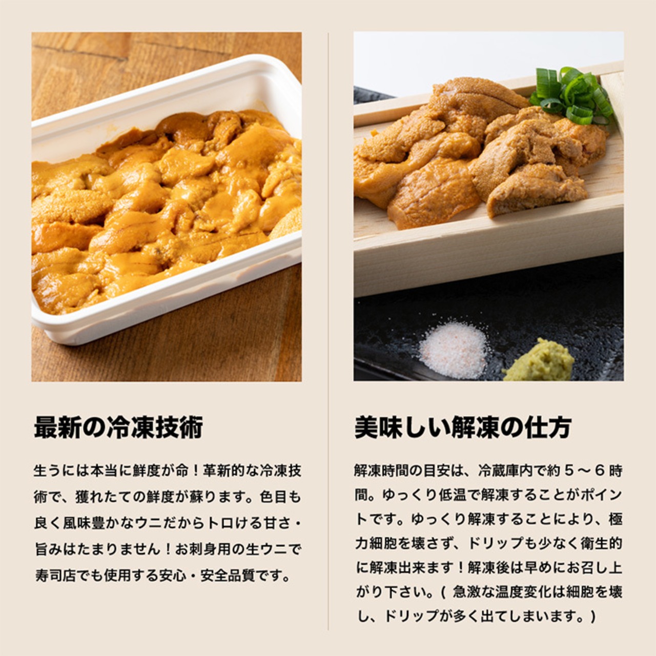 この生うには、チリの冷たい海で育まれたプリプリの食感が特徴です。口に入れると口の中に広がる濃厚な旨味は絶品で、一度食べたら忘れられない美味しさです。おうちで手巻き寿司や色々な料理に乗せるなど、自分好みの雲丹の食べ方でもお楽しみいただけます。